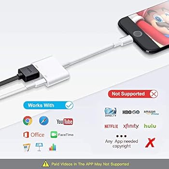The iPhone to HDMI adapter cable can support YouTube Office Safari Chrome FaceTime but NOT support NETFLIX amazon Video DIRECTV hulu. It will also fun some of my apps that I want it to do and it shows them in full screen. Lightning to HDMI Adapter for iPhone iPad Apple MFi Certified 1080P Lightning to Digital AV Adapter Sync Screen Converter with Charging Port for iPhone iPad HDMI Converter to HD TV Projector Monitor.